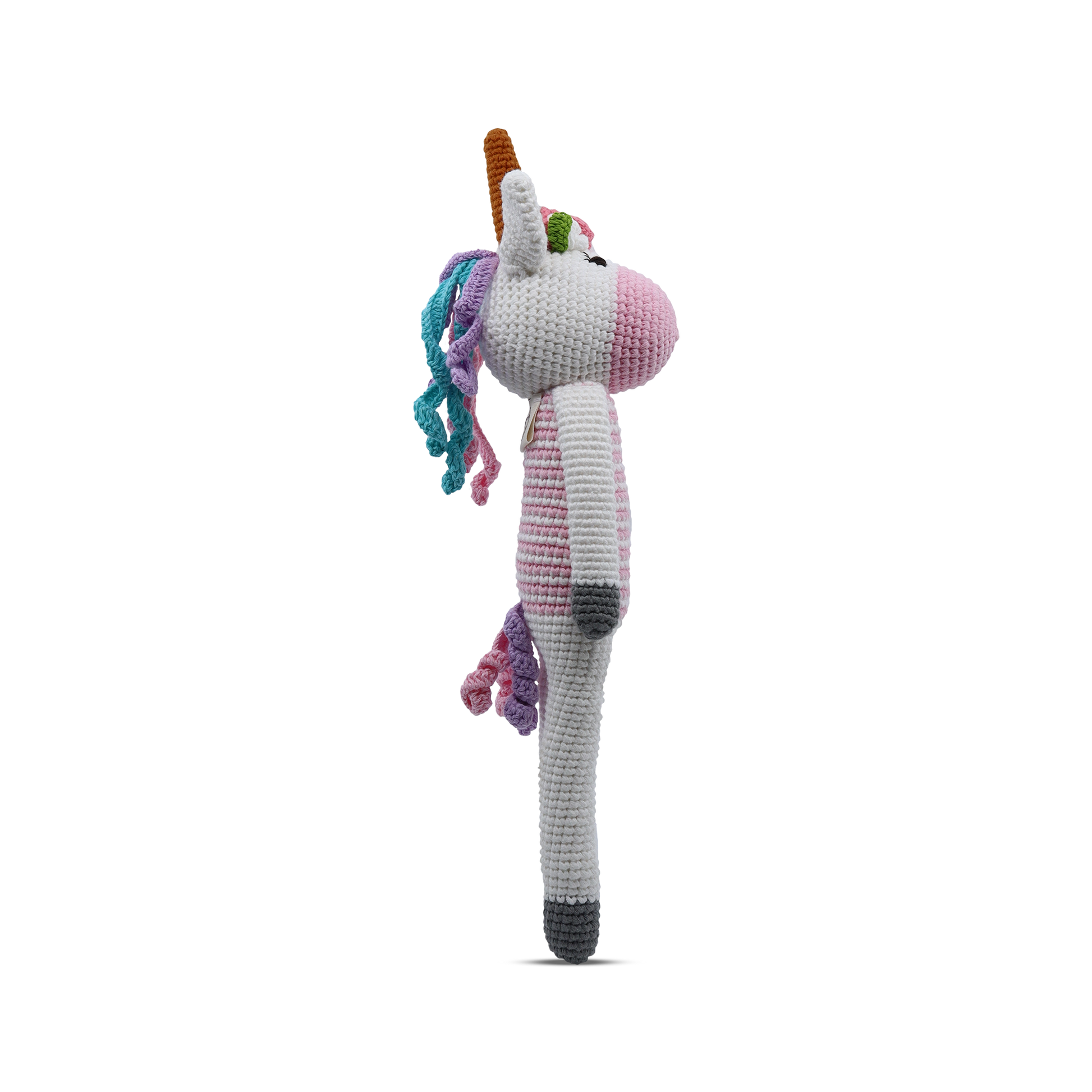 Tall, majestic and ready for adventure! This slim-standing crochet unicorn is a magical toy crafted 100% from hand with unique features like its bright pink nose, soft horn, and colourful mane. With long limbs perfect for small hands to hold and play with, this unicorn toy is an adorable addition to any nursery.